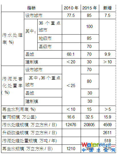 “十二五”期間各項(xiàng)建設(shè)任務(wù)目標(biāo)為:新建污水管網(wǎng)15.9萬(wàn)公里,新增污水處理規(guī)模4569萬(wàn)立方米/日,升級(jí)改造污水處理規(guī)模2611萬(wàn)立方米/日,新建污泥處理處置規(guī)模518萬(wàn)噸(干泥)/年,新建污水再生利用設(shè)施規(guī)模2675萬(wàn)立方米/日。
