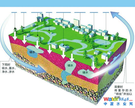 美國的雨水資源管理以提高天然滲入能力為宗旨,強調(diào)與植物、綠地、水體等自然條件和景觀結(jié)合進行生態(tài)設計,如植被緩沖帶、植物淺溝、濕地等,大量使用由屋頂蓄水或入滲池、井、草地、透水地面組成的地表回灌系統(tǒng),以獲得環(huán)境、生態(tài)、景觀等多重功效。
