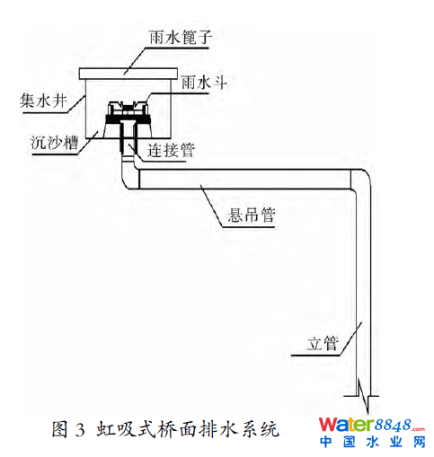 隨著城市的發(fā)展,傳統(tǒng)的重力式排水系統(tǒng)已經(jīng)不能滿足城市發(fā)展的需要,加快雨水排出速度,減少排水管道堵塞是改善排水系統(tǒng)的關鍵。隨著虹吸式排水系統(tǒng)在橋面排水中的應用,橋面積水問題得以解決,大大提高車輛在雨天行駛的安全性,同時雨水排出加快也對排水管道進行了沖洗。
