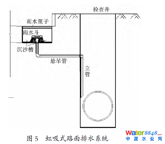 對于路面積水,增加雨水口數(shù)量和雨水篦子格柵板寬度只能讓雨水流入雨水口的面積增大,而不能達到主動排水,加快雨水流入雨水口速度的效果,這是改進現(xiàn)有路面排水系統(tǒng)的一大難題。虹吸排水能夠減少空氣進入雨水口,在雨水口形成一定負壓,達到抽吸主動排水的效果,就像在雨水口安裝了一臺水泵,能夠加快雨水進入雨水口,迅速排走,減少路面積水,提高雨水排水系統(tǒng)的排水能力。