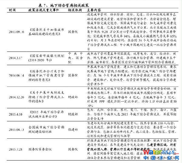 投資要點(diǎn): 地下綜合管廊:城市地下“生命線”,政府政策加碼推進(jìn)建設(shè)。地下綜合管廊是“城市地下管線綜合體”,是保障城市運(yùn)行的重要基礎(chǔ)設(shè)施和“生命線”。與發(fā)達(dá)國(guó)家與地區(qū)相比,我國(guó)地下綜合管廊建設(shè)起步晚。進(jìn)入2014年之后,地下綜合管廊政策密集出臺(tái)并不斷加碼、細(xì)化。同時(shí),住建部在全國(guó)36個(gè)大中城市全面啟動(dòng)地下綜合管廊試點(diǎn)工程,我們認(rèn)為以試點(diǎn)示范將為后續(xù)城市地下管廊建設(shè)提供案例和參照,有望帶動(dòng)全國(guó)建設(shè)地下綜合管廊的積極性。 市場(chǎng)容量大,但從年投資額來(lái)看對(duì)公司業(yè)績(jī)影響有限。1)千億市場(chǎng),空間巨大:我們以地下管廊建設(shè)完備的國(guó)家與地區(qū)人均管廊公里數(shù)來(lái)估計(jì)我國(guó)未來(lái)地下管廊市場(chǎng)空間。近似得出,若具備完善的地下管廊體系,廊體總投資約在1.6萬(wàn)億-3.2萬(wàn)億之間。國(guó)務(wù)院要求2020年建設(shè)完成一批完善的地下管廊體系,我們假設(shè)每年投資額均相同,且2020年完成投資,則每年廊體投資額約為3200-6400億元。2)年均千億的投資對(duì)公司業(yè)績(jī)影響有限:取投資額均值4800億元,占2014年基建投資(11.22萬(wàn)億)比為4.28%;具體到勘察設(shè)計(jì)行業(yè),預(yù)計(jì)每年地下管廊的工程勘察設(shè)計(jì)業(yè)務(wù)投資額約為144億元,占2014年我國(guó)工程咨詢行業(yè)營(yíng)業(yè)收入的比例為2.1%;此外從增量空間考慮,給排水管線等管線工程已在城市相關(guān)規(guī)劃投資之中,地下綜合管廊只是把相關(guān)管線集中建設(shè),因此地下管廊對(duì)城市市政管線工程建設(shè)的市場(chǎng)帶來(lái)的增量空間相對(duì)有限。具體到公司層面,管廊投資對(duì)營(yíng)收的貢獻(xiàn)同樣有限。 認(rèn)清“地下管廊”主題投資的本質(zhì),期待主題熱點(diǎn)擴(kuò)散。地下管廊建設(shè)對(duì)基建投資的拉動(dòng)小、對(duì)公司業(yè)績(jī)貢獻(xiàn)有限,且短期存在眾多制約因素,因此我們認(rèn)為,本輪的“地下管廊”本質(zhì)上仍然是主題投資,且從“地下管廊”的預(yù)估投資額來(lái)看,僅僅針對(duì)“地下管廊”的主題投資持續(xù)性有限。然而,值得注意的是,我們認(rèn)為下半年市場(chǎng)可能會(huì)從“地下管廊”的主題炒作進(jìn)一步擴(kuò)散至對(duì)“下半年全面基建刺激”的炒作,主題熱點(diǎn)有蔓延擴(kuò)散的可能。 對(duì)于建筑工程板塊來(lái)說(shuō),我們認(rèn)為以下3類標(biāo)的有望受益于地下綜合管廊主題炒作:1)在地下管廊工程設(shè)計(jì)、咨詢方面具有較強(qiáng)實(shí)力的龍頭企業(yè)有望最先受益;2)地下工程施工能力突出的企業(yè);3)工程施工建設(shè)、投融資能力等綜合實(shí)力領(lǐng)先的建筑央企,其所屬部分子公司在地下管廊建設(shè)領(lǐng)域具有較強(qiáng)的實(shí)力。 一、地下綜合管廊:城市地下“生命線” 1、地下綜合管廊簡(jiǎn)介 地下綜合管廊就是“城市市政地下管線綜合體”,即在城市沿道路或管線走廊帶建造一個(gè)地下連續(xù)結(jié)構(gòu)物,將以往直埋的市政管線,例如給水、雨水、污水、供熱、電力、通信、燃?xì)狻⒐I(yè)等各種管線集中放入其中,并設(shè)臵專門的配套系統(tǒng),按照實(shí)際需求組織的規(guī)劃、設(shè)計(jì)、建設(shè)和后期運(yùn)營(yíng)管理,是保障城市運(yùn)行的重要基礎(chǔ)設(shè)施和“生命線”。 地下綜合管廊就像建在地下的房子一樣,是城市地下管線之家,也稱“共同溝“。綜合管廊底部距離地面平均深度超過(guò)5米,有的達(dá)到8米甚至更深,其頂部距離地面也有兩三米,一般的綜合管廊,其管廊倉(cāng)高有三四米,寬接近8米,在這個(gè)隧道空間中,人和小型機(jī)械可以進(jìn)入廊內(nèi)作業(yè)。 2、相對(duì)國(guó)外,國(guó)內(nèi) 地下管廊建設(shè)仍處于起步階段 (1)法國(guó)、英國(guó)為代表的歐洲地區(qū) ——地下管廊發(fā)源地 歐洲是地下空間開(kāi)發(fā)利用的先進(jìn)地區(qū)。地下綜合管廊的發(fā)源于歐洲,在19世紀(jì),法國(guó)(1833年)、英國(guó)(1861年)、德國(guó)(1890年)等就開(kāi)始興建地下綜合管廊。至今,巴黎市區(qū)及郊區(qū)的綜合管溝總長(zhǎng)已超過(guò)2000公里。 在地下管廊投融資方面,地下管廊被視為由政府提供的公共產(chǎn)品,由于其較強(qiáng)的政府財(cái)力,其建設(shè)費(fèi)用由政府承擔(dān); 在運(yùn)營(yíng)管理方面,建設(shè)完成后,政府以出租的形式提供給管線單位實(shí)現(xiàn)投資的部分回收。在出租價(jià)格上沒(méi)有統(tǒng)一規(guī)定,由市議會(huì)討論并表決確定當(dāng)年的出租價(jià)格,并可根據(jù)實(shí)際情況逐年調(diào)整變動(dòng)。同時(shí)在國(guó)家的相關(guān)法律中有規(guī)定,一旦地下建設(shè)有綜合管廊,相關(guān)管線單位必須通過(guò)共同溝埋設(shè)管線,不得再采用傳統(tǒng)埋設(shè)方法。 (2)日本——地下管廊規(guī)模較大、最先進(jìn)的國(guó)家之一 日本綜合管溝建設(shè)開(kāi)始于1926年,目前已發(fā)展成為世界上綜合管溝建設(shè)規(guī)模較大、最先進(jìn)的國(guó)家之一,其目前在綜合管溝的