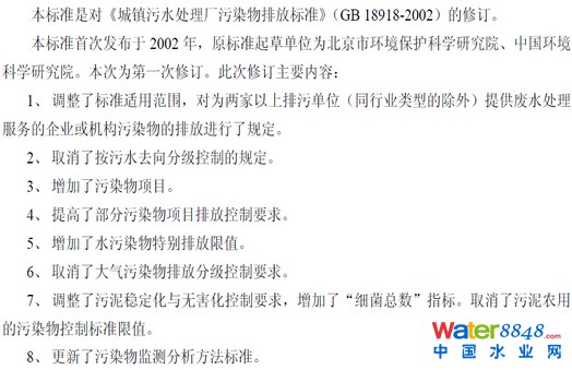2015年11月4日,環(huán)境保護(hù)部科技標(biāo)準(zhǔn)司發(fā)布《城鎮(zhèn)污水處理廠污染物排放標(biāo)準(zhǔn)(征求意見稿)》(以下稱,征求意見稿),向社會(huì)各界廣泛征集修訂意見,國(guó)家環(huán)境保護(hù)標(biāo)準(zhǔn)《城鎮(zhèn)污水處理廠污染物排放標(biāo)準(zhǔn)》(GB 18918—2002)將在發(fā)布13年后首次修訂。征求意見稿中主要涉及8項(xiàng)修訂內(nèi)容,包括調(diào)整適用范圍、取消按去向分級(jí)控制、增加污染物項(xiàng)目、提高排放要求、增加特別排放限制、取消大氣污染排放分級(jí)、調(diào)整污泥控制要求、更新監(jiān)測(cè)標(biāo)準(zhǔn)。