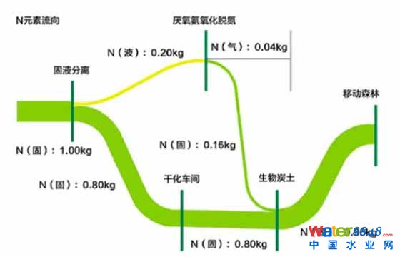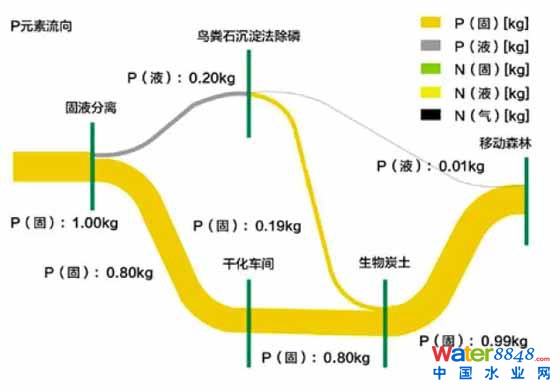 根據(jù)魚(yú)梁洲項(xiàng)目的設(shè)計(jì),原污泥中80%的氮進(jìn)入沼渣,隨后轉(zhuǎn)化為生物炭土;而進(jìn)入沼液的氮經(jīng)過(guò)厭氧氨氧化法和鳥(niǎo)糞石沉淀法后有20%形成氮?dú)馀湃氪髿,剩余的氮通過(guò)鳥(niǎo)糞石沉淀(磷酸銨鎂,分子式MgNH4PO4-6H2O)也進(jìn)入生物炭土。與氮的遷移類似,原污泥中80%的磷會(huì)進(jìn)入沼渣;而進(jìn)入沼液的磷經(jīng)過(guò)鳥(niǎo)糞石沉淀法之后有95%形成鳥(niǎo)糞石沉淀進(jìn)入生物炭土中;剩余的磷進(jìn)入最終的沼液中被用于苗木的滴灌或排入污水處理廠中。