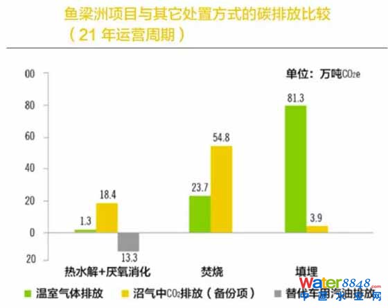 根據(jù)項(xiàng)目運(yùn)行數(shù)據(jù)測(cè)算,魚(yú)梁洲項(xiàng)目在21年的運(yùn)行期中可處置22.7萬(wàn)噸污泥,共產(chǎn)生1.3萬(wàn)噸二氧化碳當(dāng)量排放(相當(dāng)于年均產(chǎn)生606噸二氧化碳當(dāng)量排放)。根據(jù)下圖,如果對(duì)相同規(guī)模的污泥和餐廚垃圾混合物按照相同運(yùn)行周期(21年)采用填埋或焚燒進(jìn)行處置,則將分別產(chǎn)生81.3萬(wàn)噸二氧化碳當(dāng)量或23.7萬(wàn)噸二氧化碳當(dāng)量的排放,是魚(yú)梁洲項(xiàng)目溫室氣體排放的62.5倍或18.2倍。