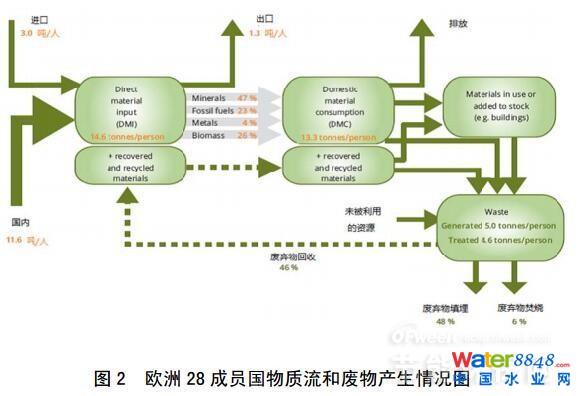 據(jù)歐洲環(huán)境署統(tǒng)計,2006年歐盟鋼鐵材料的回收比例為42%,塑料為2%,其他材料的回收比例介于兩者之間。循環(huán)經(jīng)濟方面,歐洲開展的工作重點是實現(xiàn)物質(zhì)流的循環(huán);厥詹牧系男枨蠹捌涔⿷(yīng)情況,目前由歐盟委員會負責,并且制定了原材料登記制度用以支持歐洲創(chuàng)新伙伴關(guān)系計劃。材料的輸入、廢物產(chǎn)生和回收過程如圖2所示。循環(huán)經(jīng)濟不可能完全實行閉路循環(huán)。一方面由于一些加工材料是用于提供能量,不可能完全回收;另一方面是產(chǎn)品和材料日趨復(fù)雜。例如,塑料和金屬合金的回收在技術(shù)上仍具有挑戰(zhàn)性。