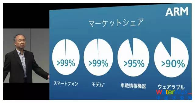 軟銀收購的ARM(英國Acorn有限公司設(shè)計(jì)的低功耗成本的第一款RISC微處理器)在移動(dòng)設(shè)備市場(chǎng)占有率高達(dá)90%。