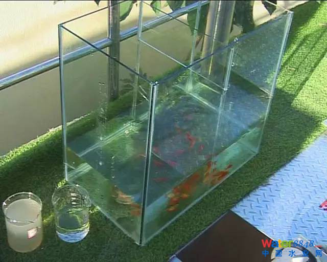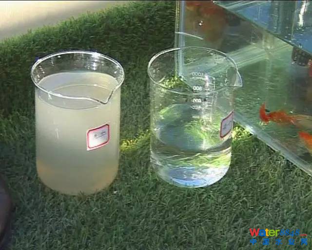 經(jīng)處理過的準(zhǔn)四類水質(zhì),與進(jìn)水水質(zhì)相比,水體變得清澈透明,將其放入一旁的魚缸上,幾條紅色的金魚在水中快樂地游著。
