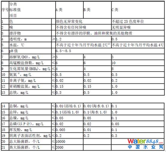 兩者共同的指標(biāo)有:水溫、pH值、溶解氧、高錳酸鹽指數(shù)、BOD5、氨氮、總磷、銅、鋅、揮發(fā)酚、陰離子表面活性劑和糞大腸菌群。