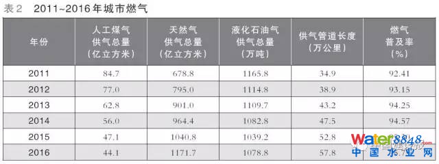 2016年,人工煤氣供氣總量44.1億立方米,天然氣供氣總量1171.7億立方米,液化石油氣供氣總量1078.8萬噸,分別比上年減少6.5%、增長12.6%、增長3.8%。人工煤氣供氣管道長度1.9萬公里,天然氣供氣管道長度55.1萬公里,液化石油氣供氣管道長度0.9萬公里,分別比上年減少13.0%、增長10.6%、減少3.3%。用氣人口4.57億人,燃?xì)馄占奥?5.75%,比上年增加0.45個(gè)百分點(diǎn)。(表2)
