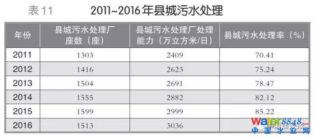 2016年年末,全國縣城共有污水處理廠1513座,比上年減少86座,污水廠日處理能力3036萬立方米,比上年增長1.2%,排水管道長度17.2萬公里,比上年增長2.4%?h城全年污水處理總量81億立方米,污水處理率87.38%,比上年增加2.16個(gè)百分點(diǎn),其中污水處理廠集中處理率85.8%,比上年增加2.34個(gè)百分點(diǎn)。(表11)