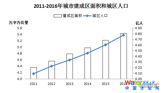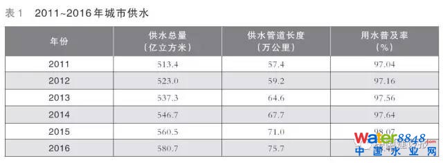 2016年年末,城市供水綜合生產(chǎn)能力達(dá)到3.03億立方米/日,比上年增長2.2%,其中,公共供水能力2.39億立方米/日,比上年增長3.4%。供水管道長度75.7萬公里,比上年增長6.5%。2016年,年供水總量580.7億立方米,其中,生產(chǎn)運(yùn)營用水160.7億立方米,公共服務(wù)用水81.6億立方米,居民家庭用水220.5億立方米。用水人口4.70億人,人均日生活用水量176.9升,用水普及率98.42%[6],比上年增加0.35個(gè)百分點(diǎn)。2016年,城市節(jié)約用水57.6億立方米,節(jié)水措施總投資29.5億元。(表1)