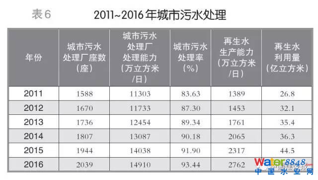 2016年年末,全國城市共有污水處理廠2039座,比上年增加95座,污水處理廠日處理能力14910萬立方米,比上年增長6.2%,排水管道長度57.7萬公里,比上年增長6.9%。城市年污水處理總量448.8億立方米,城市污水處理率93.44%,比上年增加1.54個(gè)百分點(diǎn),其中污水處理廠集中處理率89.80%,比上年增加1.83個(gè)百分點(diǎn)。城市再生水日生產(chǎn)能力2762萬立方米,再生水利用量45.3億立方米。(表6)