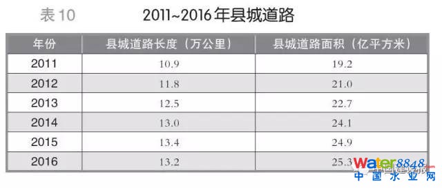 2016年年末,縣城道路長度13.2萬公里,比上年減少1.4%,道路面積25.3億平方米,比上年增長1.6%,其中人行道面積6.3億平方米,人均城市道路面積16.41平方米,比上年增加0.43平方米。2016年,全國縣城新建地下綜合管廊214公里,形成廊體59公里。(表10)