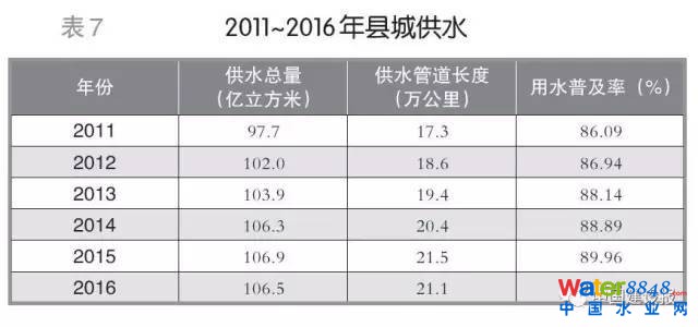 2016年年末,縣城供水綜合生產(chǎn)能力達(dá)到0.54億立方米/日,比上年減少6.0%,其中,公共供水能力0.46億立方米/日,比上年減少3.3%。供水管道長度21.1萬公里,比上年減少1.6%。2016年,全年供水總量106.5億立方米,其中生產(chǎn)運(yùn)營用水27.0億立方米,公共服務(wù)用水11.6億立方米,居民家庭用水48.9億立方米。用水人口1.40億人,用水普及率90.5%,比上年增加0.54個(gè)百分點(diǎn),人均日生活用水量119.43升。2016年,縣城節(jié)約用水2.3億立方米,節(jié)水措施總投資2.98億元。(表7)