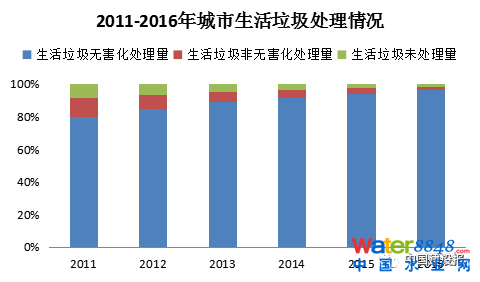 2016年年末,全國城市道路清掃保潔面積79.5億平方米,其中機(jī)械清掃面積47.5億平方米,機(jī)械清掃率59.7%。全年清運(yùn)生活垃圾、糞便2.17億噸,比上年增長5.3%。全國城市共有生活垃圾無害化處理場(chǎng)(廠)940座,比上年增加50座,日處理能力62.1萬噸,處理量1.97億噸,城市生活垃圾無害化處理率96.62%,比上年增加2.52個(gè)百分點(diǎn)。