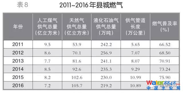 2016年,人工煤氣供應(yīng)總量7.2億立方米,天然氣供氣總量105.7億立方米,液化石油氣供氣總量219.2萬噸,分別比上年減少12.5%、增長3.0%、減少4.7%。人工煤氣供氣管道長度0.14萬公里,天然氣供氣管道長度10.60萬公里,液化石油氣供氣管道長度0.16萬公里,分別比上年減少0.7%、減少0.5%、減少23.6%。用氣人口1.21億人,燃?xì)馄占奥?8.19%,比上年增加2.29個(gè)百分點(diǎn)。(表8)