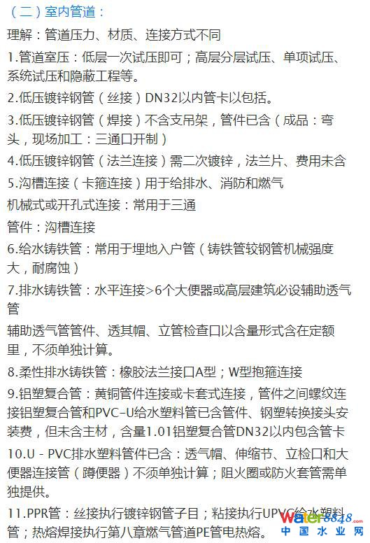 19.室內(nèi)排水管材:U-PVC排水管、鑄鐵管、混凝土管、組成洗臉盆和飲用噴水器到共用水封之間和連接衛(wèi)生器具排水短管處可用鋼管。