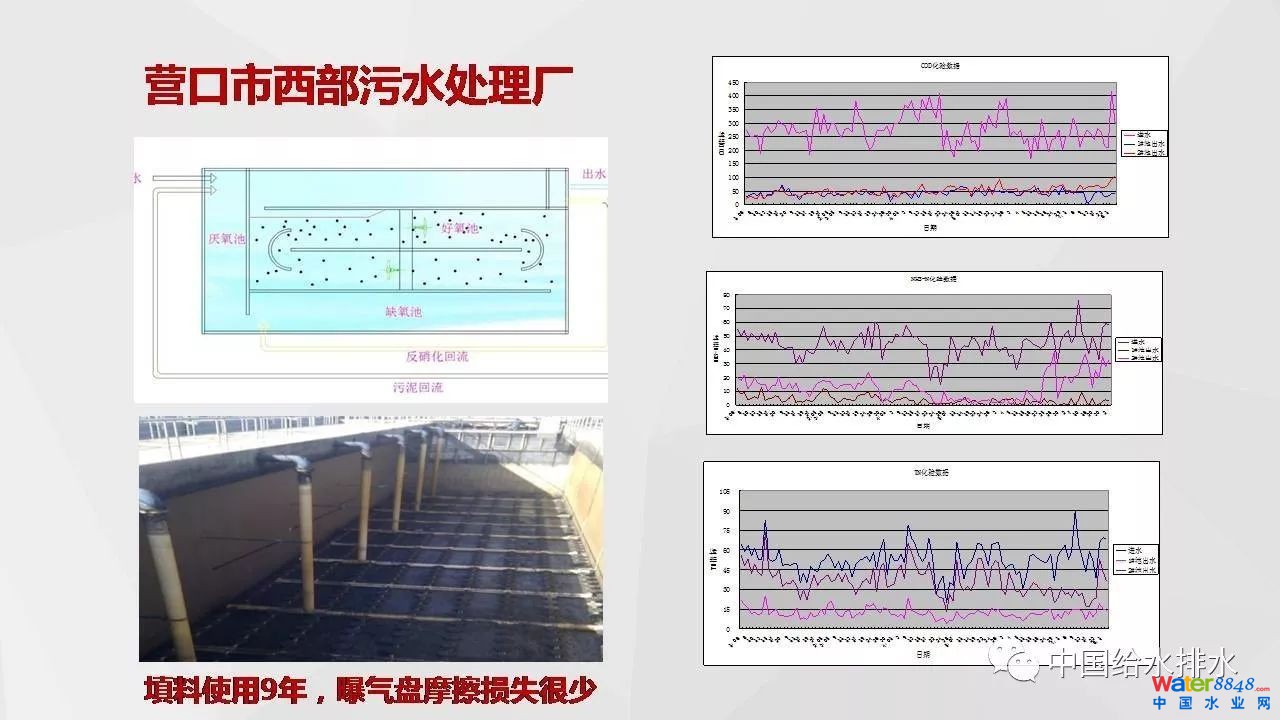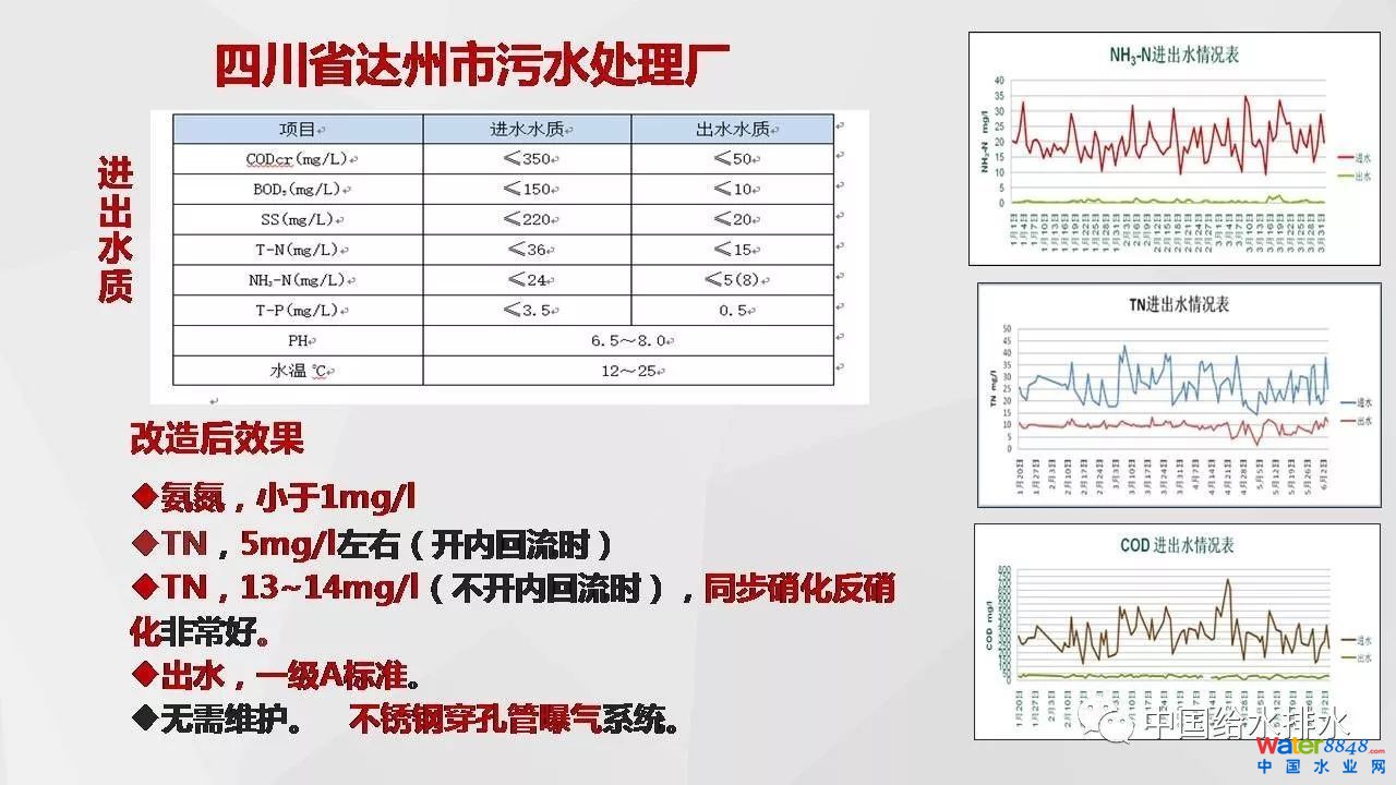 它的工藝是這樣的,下圖左上方的圖,在好氧池第一廊道和第二廊道投放填料,用推進器推動疏導(dǎo),讓填料在池內(nèi)循環(huán),不在網(wǎng)前堆積。下圖右面3個圖,改造后COD,氨氮,總氮出水穩(wěn)定達到一級A,尤其冬季水溫在8攝氏度左右時,都能穩(wěn)定達標。