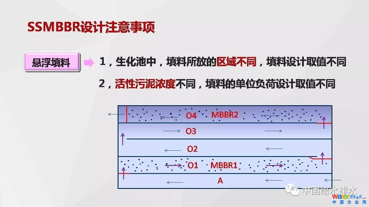 一、生化池中,填料所投放的區(qū)域不同,填料的設(shè)計取值就不同。(如下圖)好氧池中,填料投放在第一個廊道O1和最后一個廊道O4,填料所承載的硝化負荷是不同的,有時相差非常大,因此設(shè)計時,準確取值填料負荷非常重要,否則,會因填料量不足不能達標,或者,因填料量太多而浪費。二、系統(tǒng)內(nèi)活性污泥濃度的設(shè)定不同,填料的負荷取值不同,這個比較好理解,因為填料上的微生物和活性污泥有競爭關(guān)系。