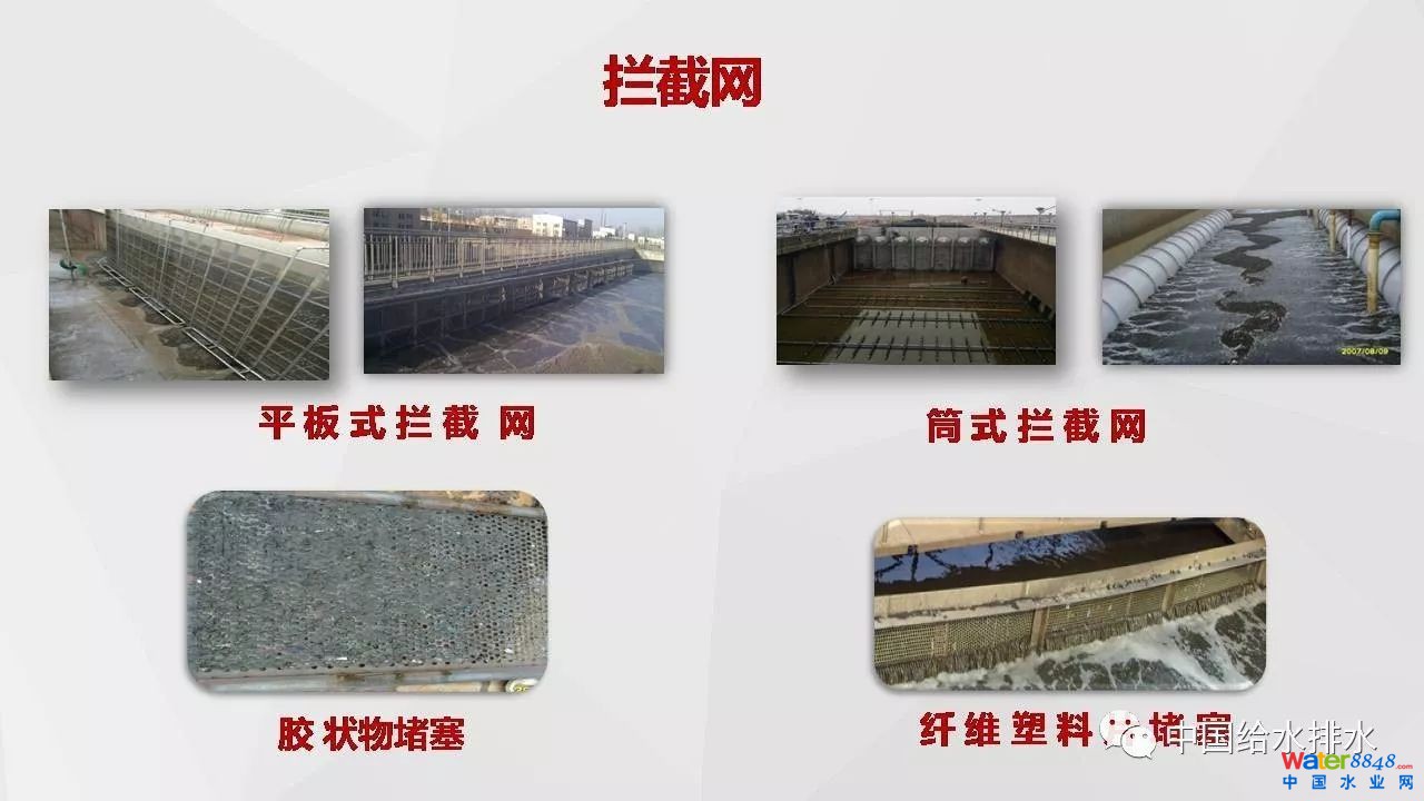 SSMBBR工藝第二部分:攔截網(wǎng)。它的作用是攔截填料流失,同時避免纖維等雜物堵塞攔截網(wǎng)。攔截網(wǎng)分平板式攔截網(wǎng)和筒式攔截網(wǎng)。左圖是平板式攔截網(wǎng),右圖是筒式攔截網(wǎng),攔截網(wǎng)的設(shè)計非常重要。生化池前面雖然有粗細格柵,但是,水在生化反應(yīng)后,經(jīng)常有膠狀物產(chǎn)生,如左下方的圖,并且有頭發(fā)絲、纖維塑料片等隨著進水刮風(fēng)流入系統(tǒng),堵塞攔截網(wǎng),如右下方的圖,所以網(wǎng)前要有自清洗系統(tǒng),防止堵塞攔截網(wǎng)。