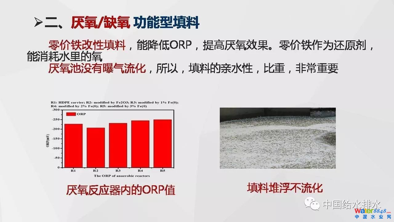 第二種是厭氧/缺氧功能型填料。零價鐵改性,能降低ORP,提高厭氧效果。因厭氧池沒有曝氣,所以,填料的親水性和比重非常重要。厭氧池內(nèi)填料是靠攪拌器推動流化,如果親水性不好,比重輕,填料會堆浮在上面,如右下圖,需要大功率攪拌器推動流化,這樣不僅能耗高,而且空氣中的氧會隨著水流的波動溶進水里,降低厭氧效果。所以,厭氧/缺氧功能填料的親水性和比重,對于好的流化是非常重要的。