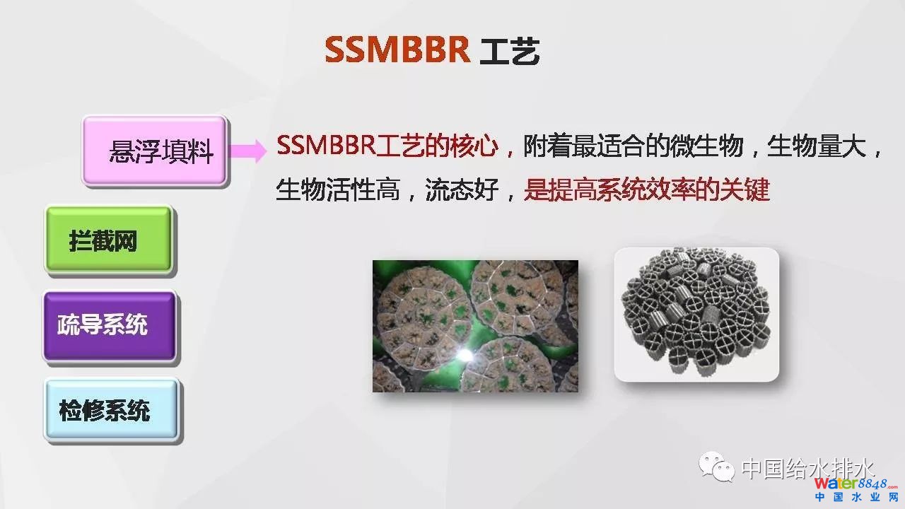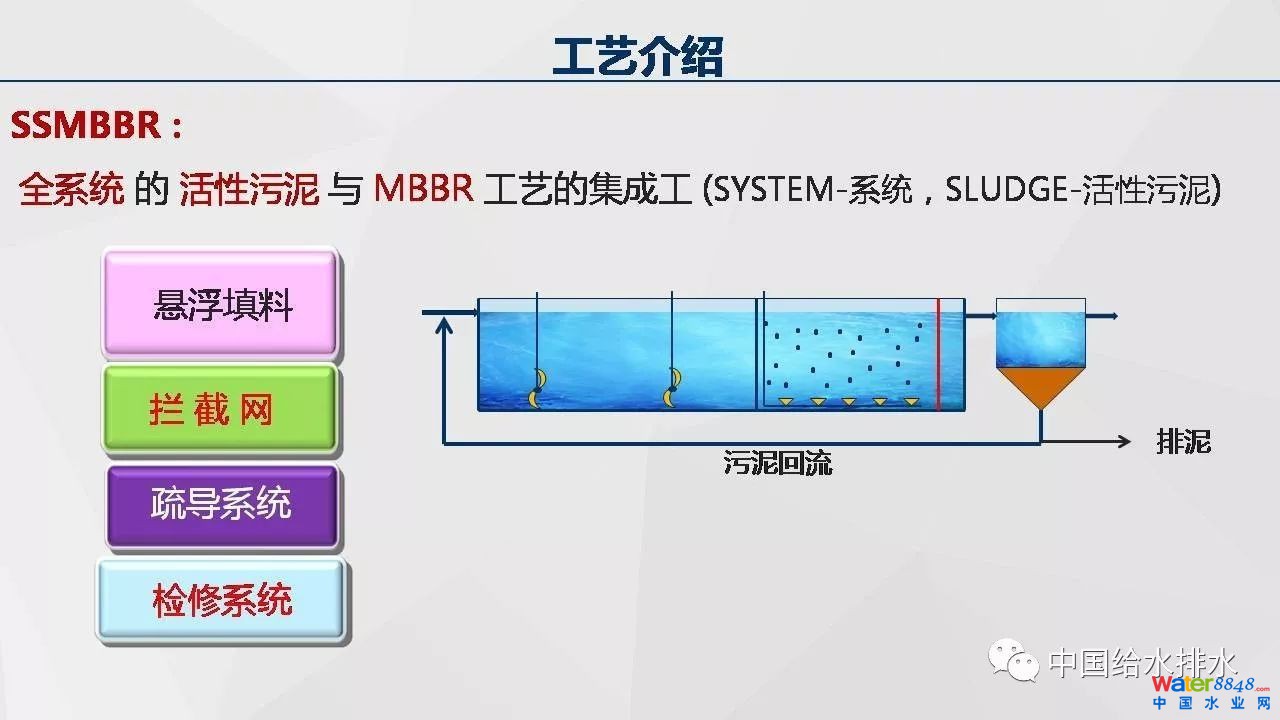今天給大家重點講的是SSMBBR工藝,它是全系統(tǒng)的活性污泥和MBBR工藝的集成工藝。第一個S-SYSTEM是指系統(tǒng),第二個S-SLUDGE是指活性污泥,它是IFAS工藝的一種,包括活性污泥之外還包括懸浮填料,攔截網(wǎng),疏導(dǎo)系統(tǒng)和檢修系統(tǒng)。