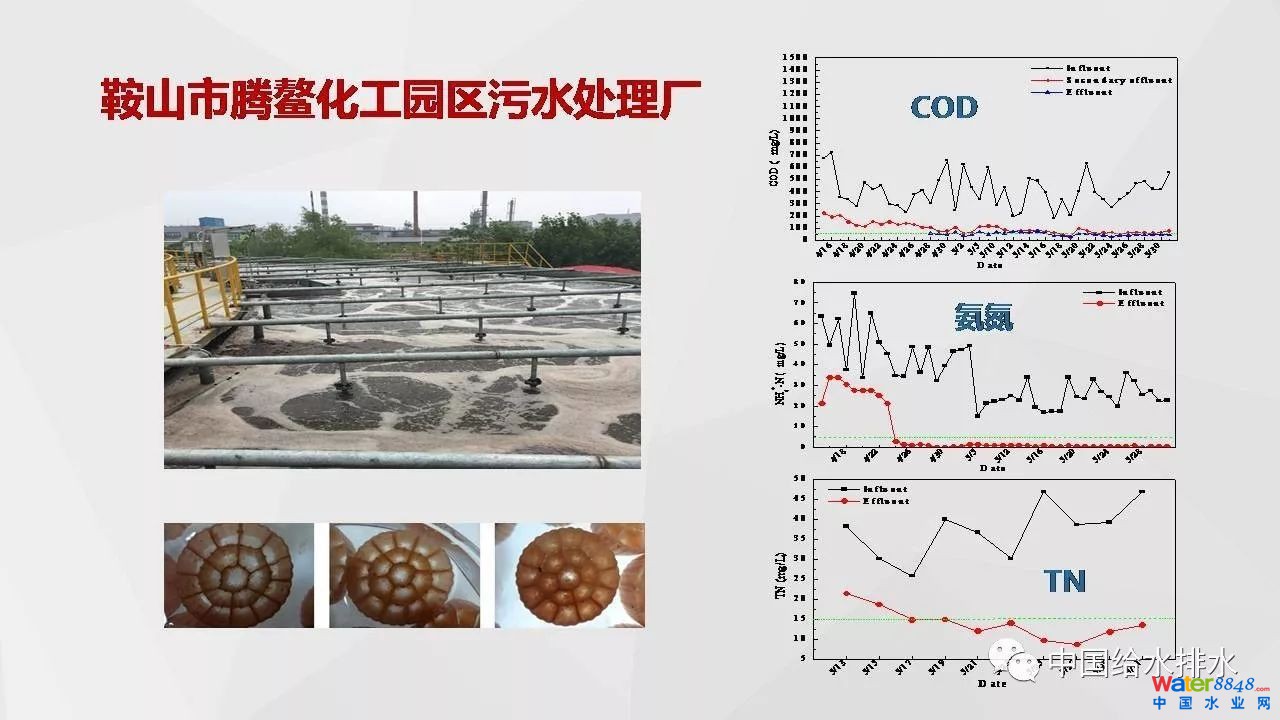 (下圖,左上方的圖)生化池出水,除SS是20外,其它都是一級A,后面有過濾系統(tǒng)去除SS。當時我們說這種設(shè)計,同步硝化反硝化效果非常好,甲方是半信半疑。結(jié)果,改造完之后,(下圖,左下方的圖)出水氨氮小于1,TN:在5左右(這是有內(nèi)回流時),沒有內(nèi)回流時,TN:在13-14。好氧池同步硝化反硝化效果非常好,而且非常穩(wěn)定。下圖,右面三個圖是監(jiān)測數(shù)據(jù)。