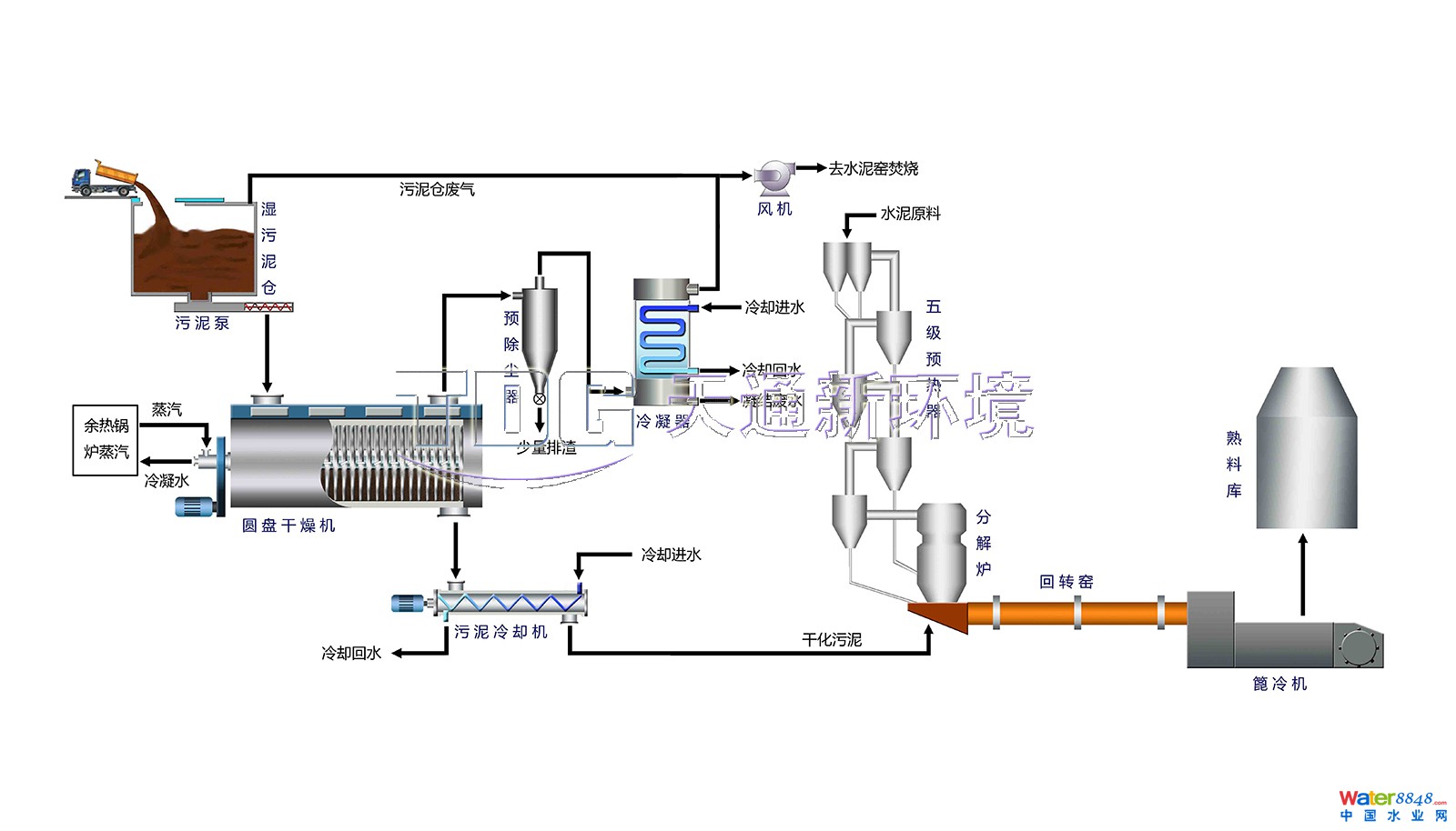 濕污泥由污泥車運至濕污泥倉,然后被泵送至干燥機內,利用AQC爐或SP爐或背壓汽輪機做功后的乏汽,作為干化熱源,濕污泥定量進入干燥機后,通過圓盤的緩慢轉動使污泥翻轉、攪拌,不斷更新加熱界面,充分與被加熱的機身和圓盤接觸、換熱,使污泥所含的表面水分蒸發(fā)。同時,污泥隨導向機構推向出料口方向輸送,在輸送中繼續(xù)攪拌,使污泥被干化。干污泥由出料口排出,作為輔助燃料被輸送至水泥回轉窯內焚燒處置。蒸氣與濕污泥換熱后冷凝,由熱水循環(huán)泵回流至鍋爐系統(tǒng)內循環(huán)利用,污泥干化過程中成生一定量的尾氣,其主要成分為水蒸汽,經(jīng)過冷凝除濕后的尾氣引至水泥回轉窯焚燒除臭。