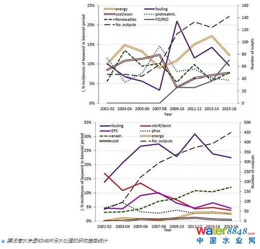 ▲ 膜法海水滲透和MBR污水處理的研究趨勢(shì)統(tǒng)計(jì)