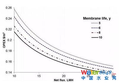 通過(guò)對(duì)主要參數(shù)的計(jì)算對(duì)比可以發(fā)現(xiàn),膜通量是OPEX中影響力最高的因子,因?yàn)樗瑫r(shí)影響了單位能耗和膜更換的成本。