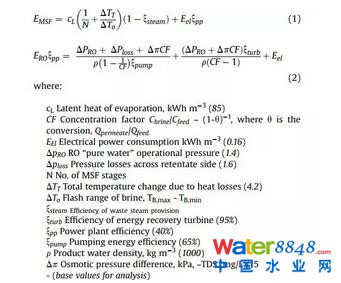 MSF和RO的能耗對(duì)比一般用以下公式進(jìn)行計(jì)算,其中公式(1)計(jì)算MSF熱法淡化的單位能耗,公式(2)則對(duì)應(yīng)RO的單位能耗。
