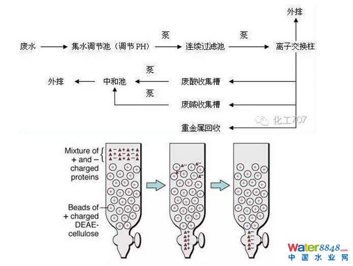 用離子交換樹脂把廢水中的重金屬離子交換出來,從而除去重金屬離子。不過,離子交換樹脂價格昂貴,其再生費(fèi)用也比較高,所以,在廢水處理中使用很少。但對于少量有回收價值的有毒金屬來說是個不錯的方法。