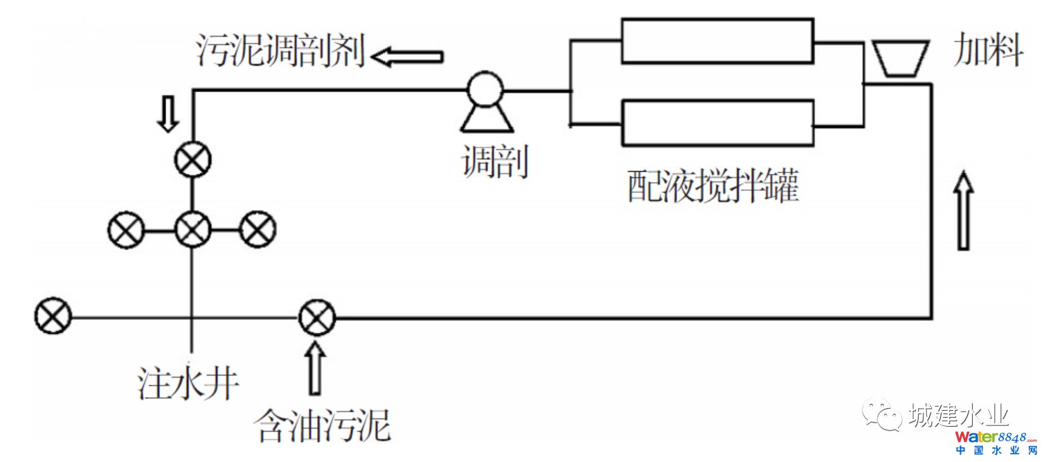 回注調(diào)剖技術(shù)是利用含油污泥與油層之間有良好的配伍性,以含油污泥為基本原料,通過加入分散劑、懸浮劑等化學(xué)藥劑并進(jìn)行配伍,制成含油污泥調(diào)剖劑,用于注水井的調(diào)剖。其工藝流程如圖3.3所示:①含油污泥實(shí)施化學(xué)預(yù)處理;②含油污泥調(diào)剖;③含油污泥回注。