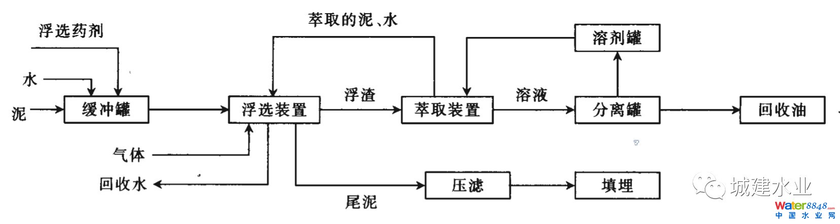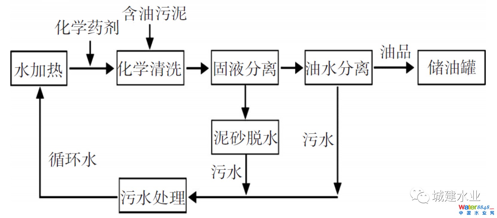 熱水洗滌法是美國環(huán)保署處理含油污泥優(yōu)先采用的方法,主要用于含泥沙多顆粒大的含油污泥的處理。一般以熱堿水溶液反復(fù)洗滌,再通過氣浮實(shí)現(xiàn)固液分離。洗滌溫度多控制在70℃左右,液固比2:l,洗滌時(shí)間20min,能將含油量為30%落地油泥洗至殘油率l%以下;旌蠅A可由廉價(jià)的無機(jī)堿和無機(jī)鹽組成。具體工藝流程見圖3.4。該方法能量消耗低,費(fèi)用不高,是我國目前研究較多、較普遍采用的含油污泥處理方法。