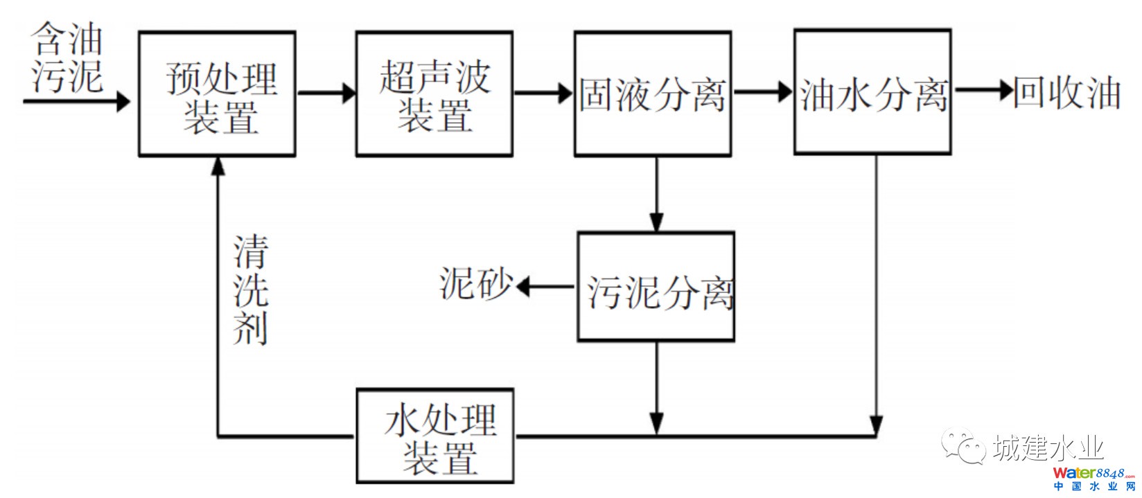 超聲處理技術(shù)是通過聲場的機(jī)械振動(dòng)、空化效應(yīng)及熱作用來破壞含油污泥的結(jié)構(gòu),降低污泥中原油的黏度,減小原油與無機(jī)固體間的黏附作用,從而使含油污泥中的油和泥砂分離。其工藝流程如圖3.5所示:①清洗劑預(yù)處理含油污泥;②超聲分離油泥,使原油與固體顆粒分離;③旋液分離器分離油水和泥砂,泥砂通過離心機(jī)脫水,油水經(jīng)分離器分離出油。