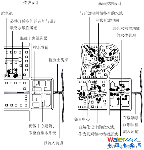 新型城市水循環(huán)的開發(fā)思路給城市設(shè)計(jì)帶來了改變。以公共開發(fā)空間為例,圖2比較了暴雨控制設(shè)計(jì)與傳統(tǒng)設(shè)計(jì)截然不同的設(shè)計(jì)思路。在傳統(tǒng)設(shè)計(jì)中,建筑是工整地排列,雨水和污水是通過集中官網(wǎng),收集處理。而在暴雨控制設(shè)計(jì)中,引入了與開放空間相整合的水池,鄰里中心等多種景觀,水系環(huán)流整個(gè)街區(qū)。據(jù)此可以總結(jié)出暴雨控制設(shè)計(jì)的五個(gè)特點(diǎn) [16] :保證受納水體水質(zhì);減少徑流和峰值流量,通過合理布置下滲池、透水鋪裝等措施降低下游流量峰值;保護(hù)天然水系,在城市發(fā)展過程中使其充分發(fā)揮作用;最小化排水設(shè)施的成本,在減少城市發(fā)展成本的同時(shí)增加效益,并使景觀得到改善,從而提升區(qū)域價(jià)值;將暴雨處理手段整合進(jìn)景觀,將雨水作為一種景觀要素。在暴雨控制設(shè)計(jì)中,水是關(guān)鍵,要綜合考慮水質(zhì)、水量、水系、水處理設(shè)計(jì)和親水景觀。