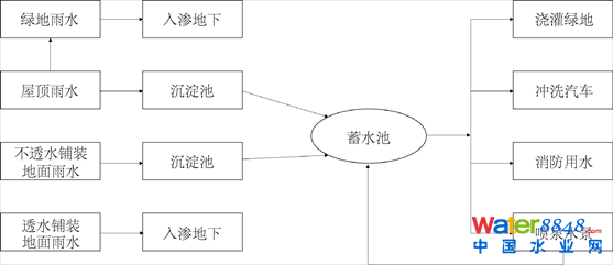 新建城區(qū)的示范工程位于雙紫園小區(qū)內(nèi),其雨洪利用工藝流程如圖4,通過對(duì)屋頂雨水的引流和透水/不透水地面鋪裝,實(shí)現(xiàn)雨水的回收利用。