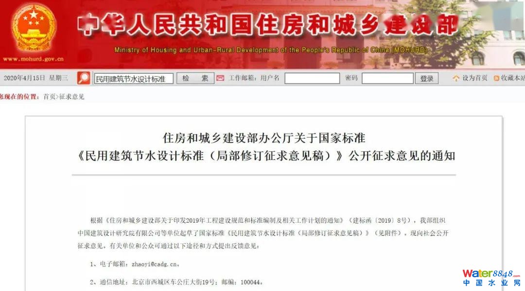 住房城鄉(xiāng)建設部官網(wǎng)4月15日消息,根據(jù)相關計劃,住房城鄉(xiāng)建設部組織中國建筑設計研究院有限公司等單位起草了國家標準《民用建筑節(jié)水設計標準(局部修訂征求意見稿)》,并向社會公開征求意見。意見反饋截止時間為2020年5月7日。