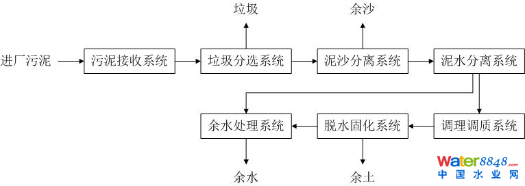 該規(guī)范所稱污泥處理工藝是在機械脫水固結(jié)的基礎(chǔ)上進行了完善:加強前置預(yù)處理,實現(xiàn)逐步減量并進行資源化再生;機械脫水固結(jié)重視過程環(huán)保和循環(huán)利用;重視后端水的處理,使回排水水質(zhì)明顯優(yōu)于原水,使水環(huán)境治理工程本身也能做到節(jié)能環(huán)保、循環(huán)利用、資源再生,同時也降低了后續(xù)的處置難度。工藝主要包含污泥接收系統(tǒng)、垃圾分選系統(tǒng)、泥沙分離系統(tǒng)、泥水分離系統(tǒng)、調(diào)理調(diào)質(zhì)系統(tǒng)、脫水固化系統(tǒng)、余水處理系統(tǒng)七大系統(tǒng),產(chǎn)生垃圾、余沙、余土和余水四種產(chǎn)出物,如圖1所示。