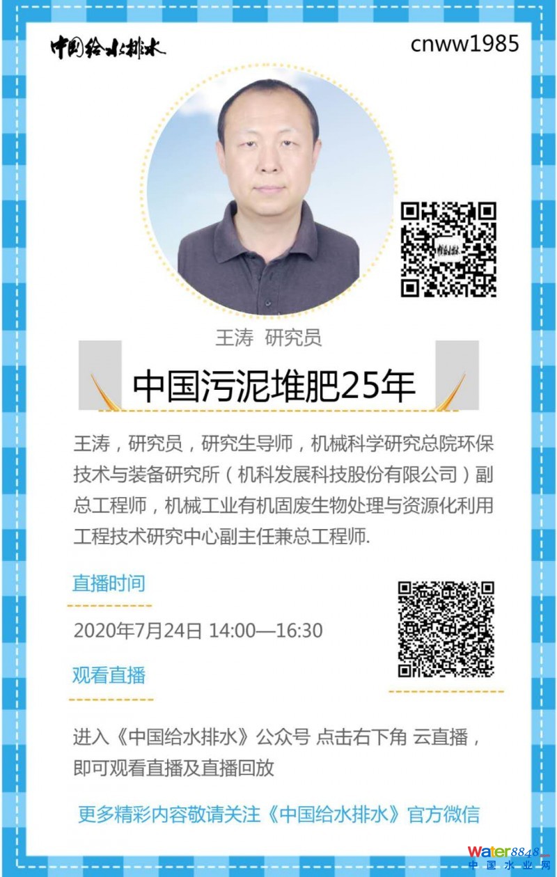 題目:中國污泥堆肥25年 直播時間 : 7月24日周五下午 14-16:30分 內(nèi)容提綱: 堆肥技術(shù)在中國污泥處理領(lǐng)域的實(shí)踐回顧、典型案例分析與思考。 主講人 :王濤,研究員,研究生導(dǎo)