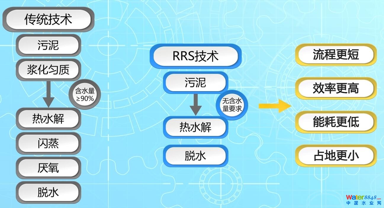 RRS®技術(shù)是環(huán)源科技針對污泥等高含水有機(jī)固廢而研發(fā)的新一代資源化處理技術(shù)。2012年,環(huán)源科技推出第一代RRS®技術(shù)——RRS®亞臨界熱水解技術(shù)。該技術(shù)克服了傳統(tǒng)熱水解技術(shù)的含固率限制,流程更短、效率更高、能耗更低、占地更小,投資和運(yùn)營成本更低;在能效、環(huán)保等方面更遙遙領(lǐng)先于熱干化和化學(xué)調(diào)理等其他傳統(tǒng)技術(shù)。
