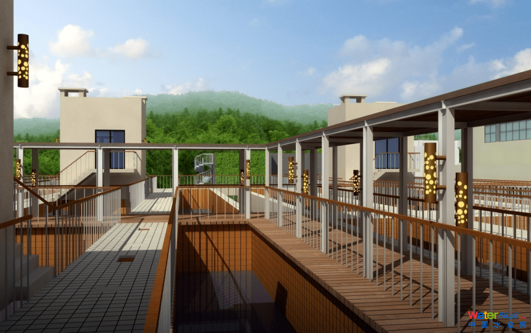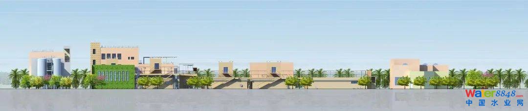 建筑物設(shè)置屋頂綠化和垂直綠化,采用外掛木條裝飾,在建設(shè)現(xiàn)代化水廠的同時,與周邊環(huán)境協(xié)調(diào)融合,打造花園景觀式“綠色”水處理廠。