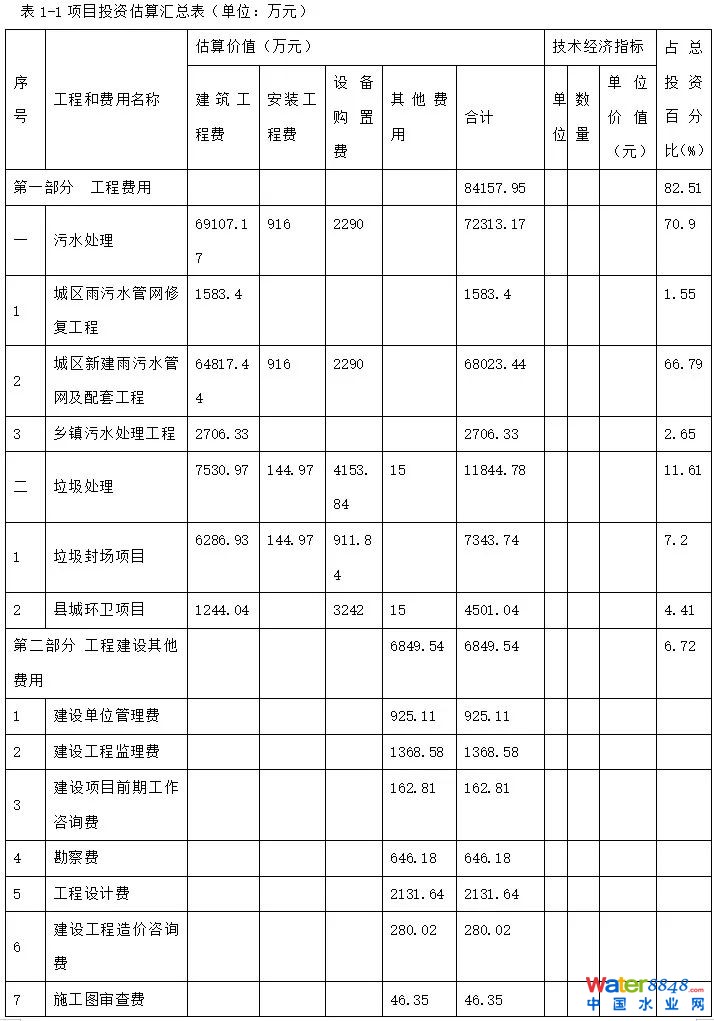 各子項(xiàng)目的建設(shè)投資金額為:其中,污水處理項(xiàng)目投資81706.16萬元,垃圾處理項(xiàng)目投資13851.70萬元,建設(shè)期利息6435萬元。
