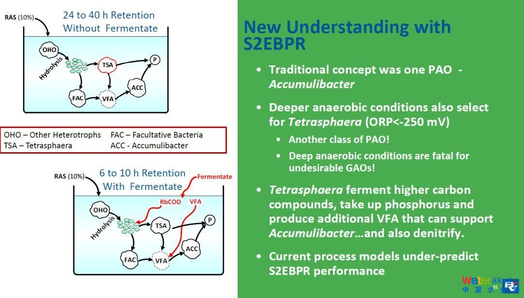 除了以上原因,我認(rèn)為還存在其它一些客觀因素。首先,近10年來(lái),隨著側(cè)流活性污泥發(fā)酵技術(shù)的發(fā)展,世界范圍內(nèi)越來(lái)越多的側(cè)流活性污泥發(fā)酵項(xiàng)目投運(yùn)(主要在丹麥,其次在美國(guó)和中國(guó)),側(cè)流RAS可實(shí)現(xiàn)的深度厭氧環(huán)境(ORP≤-300mV)提供了發(fā)酵類(lèi)PAOs菌屬存在的基本條件,傳統(tǒng)主流AAO的厭氧區(qū)(ORP在-150~-250mV甚至更高一些)則很難達(dá)到這樣的環(huán)境條件;其次,就是現(xiàn)在分子生物學(xué)技術(shù)快速發(fā)展,使得我們有機(jī)會(huì)在更加微觀的領(lǐng)域探秘到一些過(guò)去未知的活性污泥微生物的存在,如Raman–FISH技術(shù)的應(yīng)用,丹麥奧爾堡大學(xué)Per Halkjær Nielsen教授的領(lǐng)銜團(tuán)隊(duì)就是利用該技術(shù),在丹麥數(shù)十座污水廠的活性污泥分析中發(fā)現(xiàn)并確立了T.菌屬的生態(tài)位及其對(duì)生物除磷的貢獻(xiàn)。