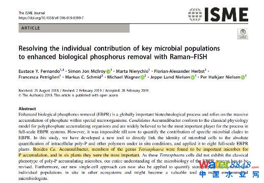 [2]Fernando Y.E. Resolving the individual contribution of key microbial populations to enhanced biological phosphorus removal with Raman–FISH. The ISME Journal,2019.3