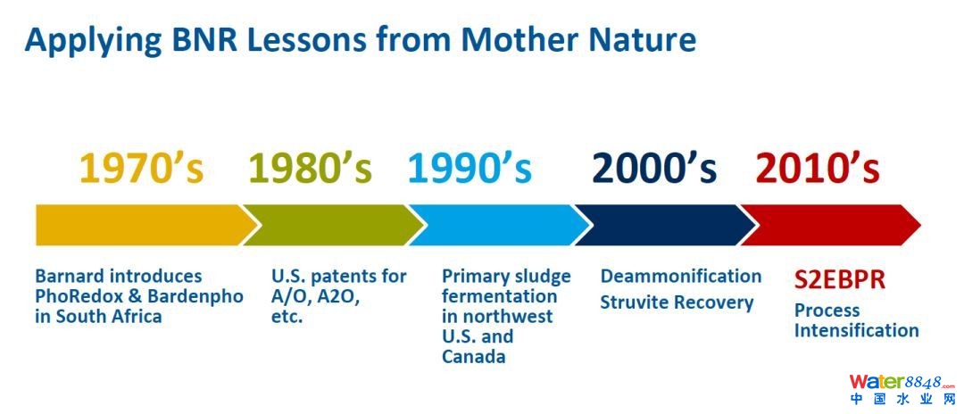 美國(guó)B&V公司總結(jié)了上世紀(jì)70年代以來(lái)污水處理營(yíng)養(yǎng)鹽去除技術(shù)發(fā)展歷程(見(jiàn)上圖),認(rèn)為2010年以后的污水處理應(yīng)該是以側(cè)流S2EBPR和工藝緊湊化&過(guò)程強(qiáng)化為基本特征的新時(shí)代。