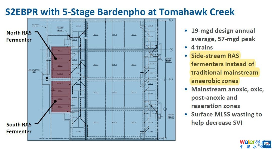 美國(guó)近幾年側(cè)流活性污泥發(fā)酵項(xiàng)目得到快速發(fā)展,舉個(gè)例子,TomahawkCreek污水廠為了強(qiáng)化生物除磷,將原來(lái)五段式Bardenpho工藝的厭氧區(qū)改造為側(cè)流EBPR: