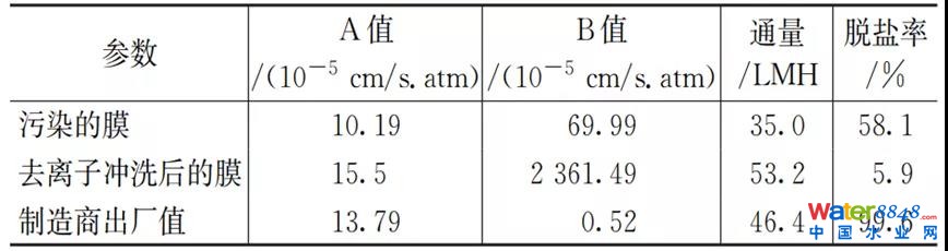 取膜切片,測(cè)定“A”和“B”值。“A”值為水通道常數(shù),是滲透流量的函數(shù),A值越高,通過(guò)膜的流量就越好。“B”值為鹽通道常數(shù),是抗鹽性的函數(shù),B指數(shù)越高,滲透液中的鹽分越多。低A值和中高B值可能表示膜有污染,低A和高B(>10)可能表示已經(jīng)水垢形成,非常高的A(>50%的制造商出廠值)或B(>500)可能表明膜降解或膜破損。測(cè)試所得的A和B的值見(jiàn)表3,分析沖洗前數(shù)據(jù),A和通量都小于出廠值,說(shuō)明膜有污堵;B值和脫鹽率均明顯劣于出廠值,膜可能存在破損現(xiàn)象;沖洗后,通量增大,B值劇增,脫鹽能力幾乎喪失,證明膜確實(shí)存在破損。