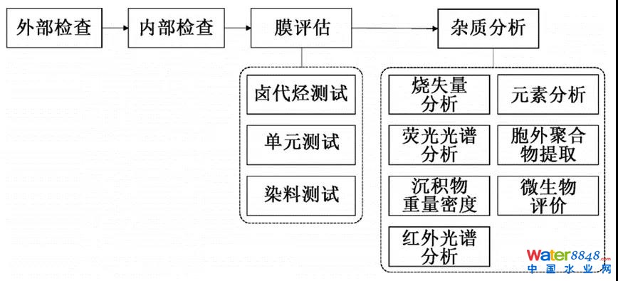 當(dāng)所有的自動(dòng)無(wú)損檢測(cè)程序和評(píng)估都不能揭示RO系統(tǒng)性能下降的原因時(shí),需要進(jìn)行元件解剖,用以分析反滲透膜污堵特性,為新生水系統(tǒng)的正常運(yùn)行提供重要數(shù)據(jù)參數(shù)支持。圖2位反滲透膜污堵檢測(cè)流程。選取樟宜2新生水廠現(xiàn)場(chǎng),反滲透系統(tǒng)二段的一個(gè)膜元件(ESPA2 MAX, Hydranautics, 美國(guó)),用于膜解剖,該膜已使用3年。