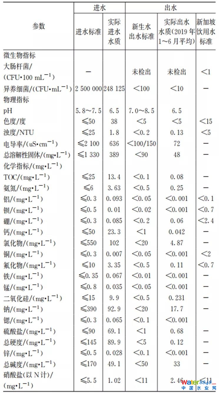 表2 樟宜2新生水廠設(shè)計(jì)與實(shí)際進(jìn)、出水水質(zhì)及其與相關(guān)標(biāo)準(zhǔn)的對(duì)比